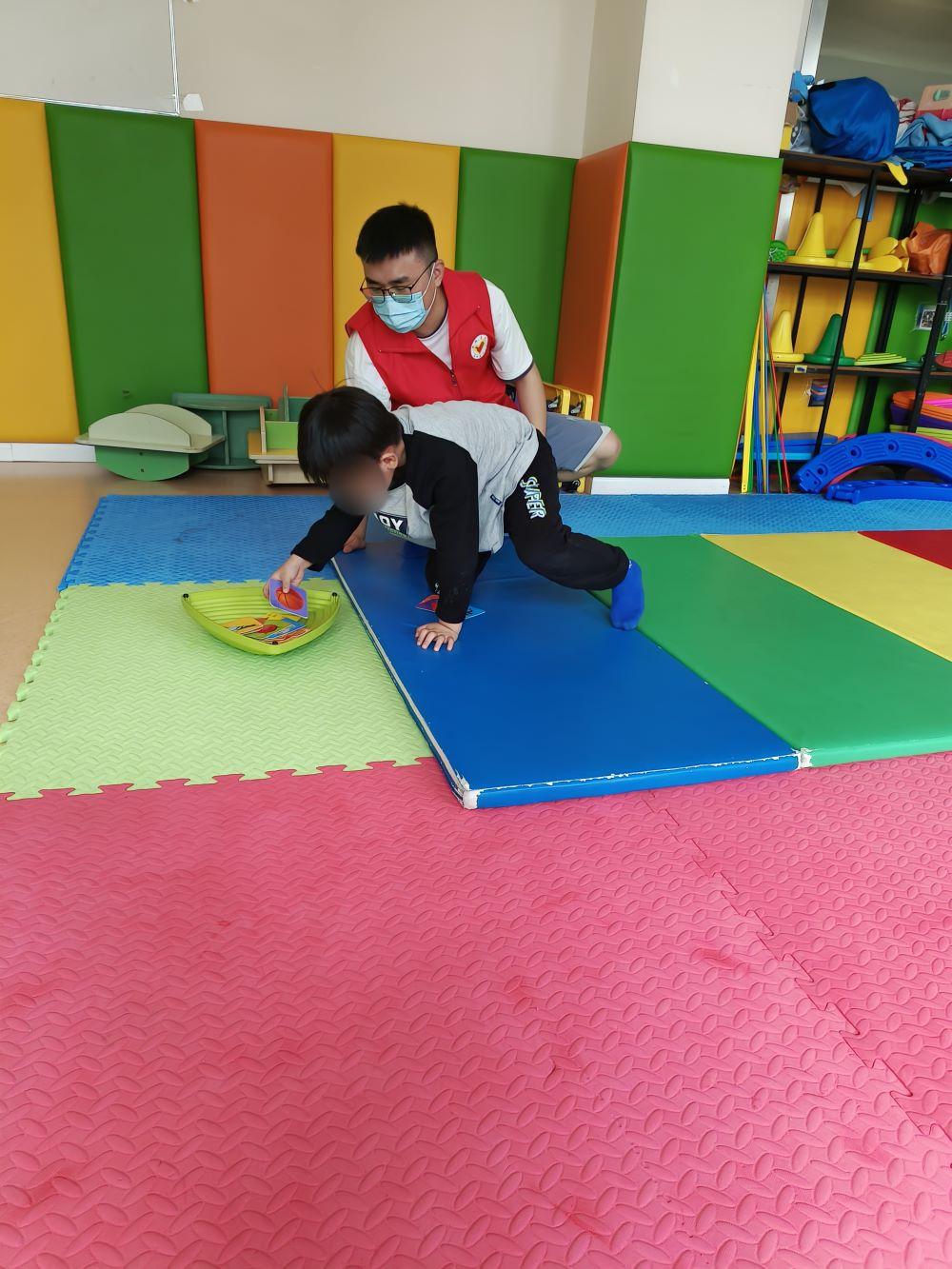 在爱之翼儿童关爱中心的志愿者服务工作已持续开展了三年有余,志愿者们对于活动的流程和操作已经非常熟练。到达服务地点后,志愿者听从负责老师的安排,陪伴小朋友们上课、做游戏、进行康复训练。课程的主要内容有:引导并帮助小朋友们进行翻滚、跳跃等动作;与小朋友们进行“炸弹来了炸弹来了bong”、“狼来了”等游戏;进行过“独木桥”、跳过障碍物、在平衡板上保持平衡等专项训练。这些看似简单的任务不仅拉近了志愿者与小朋友们之间的距离,更促进了小朋友们的康复进程。志愿者们耐心地引导小朋友们在正确的地方排队然后进行训练,尽管在课程过程中小朋友们不可避免地会摔倒或者遇到困难,但是坚强的他们从不轻言放弃,仍然坚持完成老师的任务。通过这些课程与康复训练,不仅锻炼了他们的肢体的力量和灵活程度,还培养了小朋友们的团队意识。每当听到小朋友们的欢声笑语,志愿者们也心生愉悦。小朋友们清澈的眼神中折射出对未来的希望,这也激励着志愿者们不忘初心,坚定志愿服务的信念。