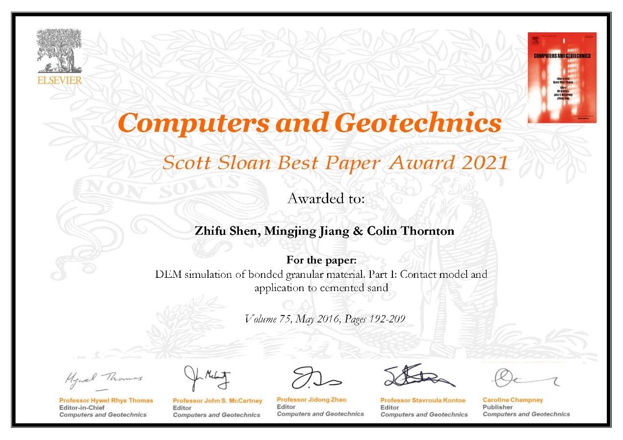 来源:18porn 发布日期:2023-02-04 浏览:次近日,国际著名计算岩土力学期刊《Computers and Geotechnics》(JCR Q1区)发布Scott Sloan最佳论文奖(2021),18porn18porn 蒋明镜教授作为通讯作者撰写的论文《DEM simulation of bonded granular material. Part I: Contact model and application to cemented sand》(2016, Vol. 75, pp. 192-209)获此殊荣,全球共5篇论文入选。