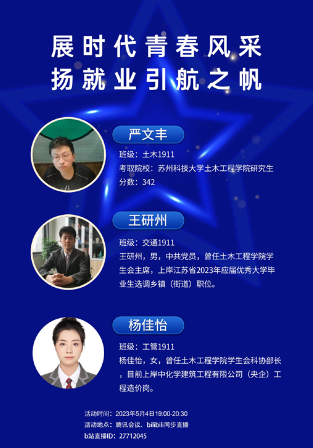 随后,三名优秀毕业班学生代表为大一学生进行就业经验分享会并进行交流互动。土木1911班严文丰同学结合自身经历,从考研动机、复习计划及备考方案三个环节为同学们进行了经验分享。他强调考研不能仅仅抱有随大流,考名校的想法,更重要的是要跳出本科教育中“什么都学,但什么都学不深刻” 的学习困境;交通1911班王研州同学首先给大家梳理了考公现状,接着分析了如何在最大程度上发挥自身优势去报考岗位,最后通过列举典型例题的形式介绍了行测和申论的做题方法,增强了同学们的代入感;工管1911班杨佳怡同学为大一学生分享了求职过程中收获的经验。她认为央企具有广阔的职业发展空间和较高的福利待遇,但入职央企也必须做好充分的准备,除了要增强自身能力,了解央企的业务范围、18porn和招聘要求外,还要利用大学期间多多积累竞赛经验以提高团队协作能力和自身综合竞争力。