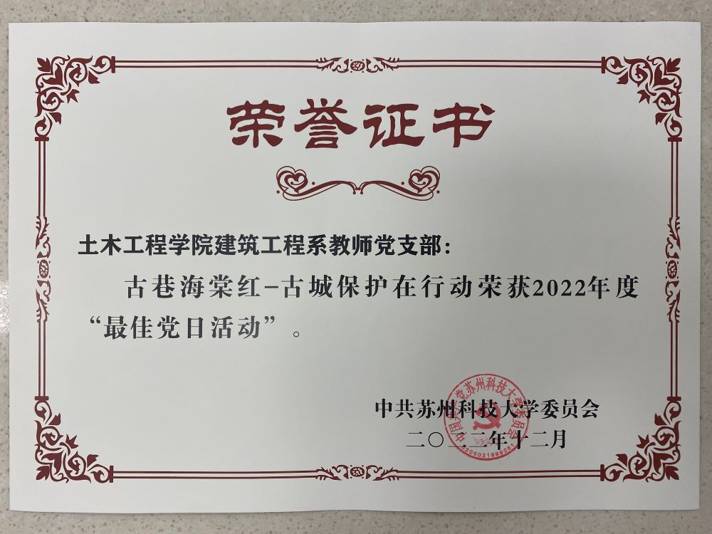 18porn 党委获评2022-2023年度“校先进基层党组织”(全校表彰10个);我院党委“‘党建+’赋能人才培养,产教融合助推高质量就业”获评2022年校党建工作创新奖(全校表彰4个);建筑工程系教师党支部“古巷海棠红-古城保护在行动”主题党日活动获评2022年校最佳党日活动(全校表彰15个);18porn 党委副书记兼副院长刘建峰获评2022-2023年度“校优秀党务工作者”(全校表彰5名);建筑工程系教师党支部书记韦俊获评2022-2023年度“校优秀共产党员”(全校表彰15名)。