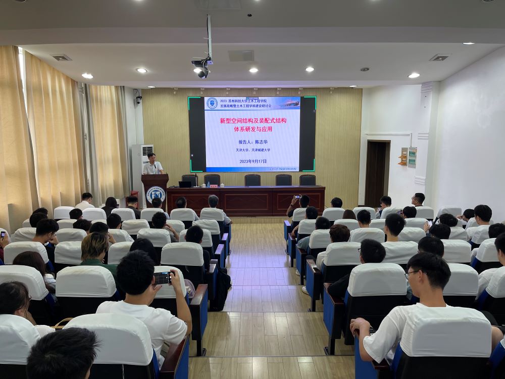 报告会中,陈志华教授从工程实践的角度,首先介绍了大跨空间结构在十三届全运会(天津)场馆应用,接着就新型组合结构体系的研发与应用,对装配式钢管混凝土组合异形柱体系和模块建筑体系的研发应用进行了精彩报告。近两个小时的报告,内容深入浅出、旁征博引,现场学术氛围热烈,与会师生认真聆听并记录,在报告结束时踊跃向陈教授提问交流,陈教授以他开阔的视野和丰富的经历一一予以解答。