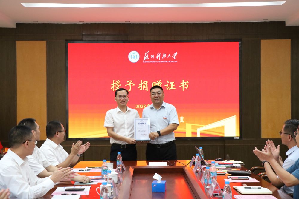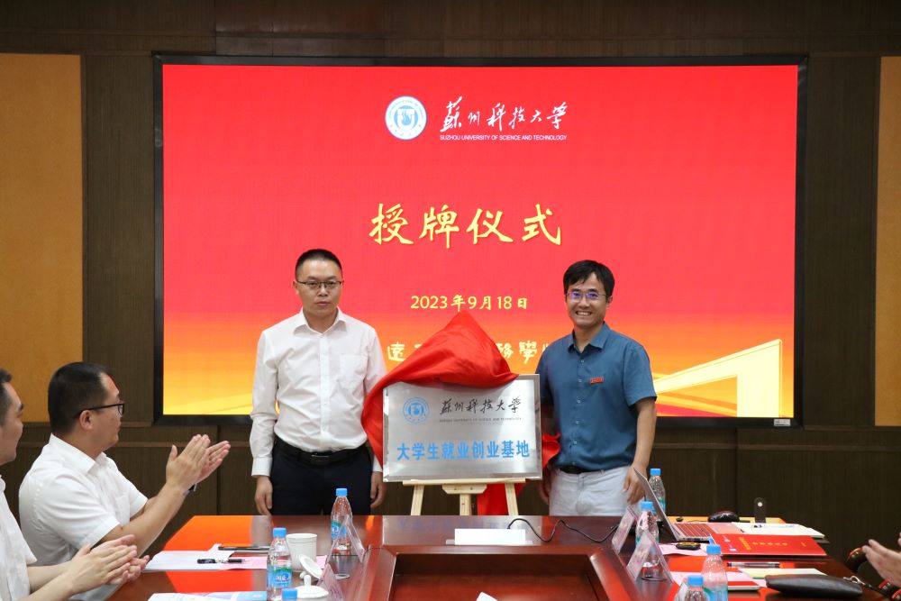 刘志强和李永旺代表校企双方签署合作协议书,张承祖向李永旺颁发捐赠证书,刘志强和陆强共同为大学生就业创业基地揭牌。
