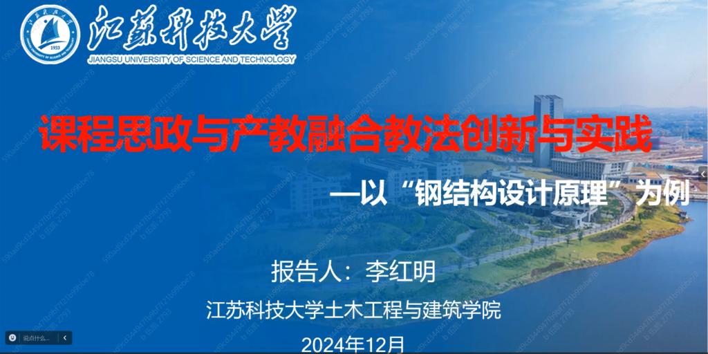 江苏科技大学土木工程与建筑18porn 党委书记李红明完成了《“钢结构设计原理”课程思政与产教融合教法创新与实践》的专题报告;江苏省电力设计院有限公司输电部主任余亮完成了《践行能源安全新战略 建设最高跨江输电塔》的专题报告;中建八局第三建设有限公司科技质量部副经理徐晓晖完成了《现代钢结构施工技术—产教融合下的探索与实践》的专题报告;河海大学国家一流本科课程主讲教师李宗京完成了《产教融合视角下的“钢结构”思政案例库与智慧课程建设》的专题报告。