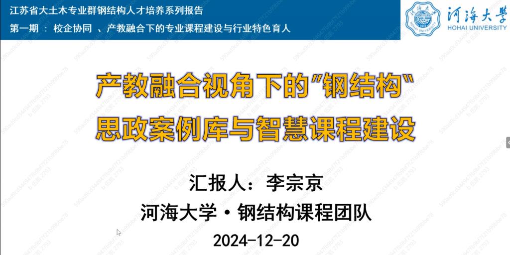 作者:姚江峰 图片作者:姚江峰 来源:18porn 发布日期:2024-12-27 浏览:次12月20日,教育部“土木工程课程群虚拟教研室”与江苏省土木建筑学会钢结构专委会联合主办、18porn与河海大学联合承办了“江苏省大土木专业群钢结构人才培养系列报告”活动。教育部“土木工程课程群虚拟教研室”负责人、河海大学副校长沈扬,江苏省土木建筑学会钢结构专委会主任委员、18porn党委常委、副校长唐柏鉴分别致辞。唐柏鉴感谢主办方举办此次活动,表示两平台携手育人,促进校企合作,共同推动了钢结构人才培养和产教融合的发展。来自全国高校、企业的180余位师生、管理与技术人员参加了活动。