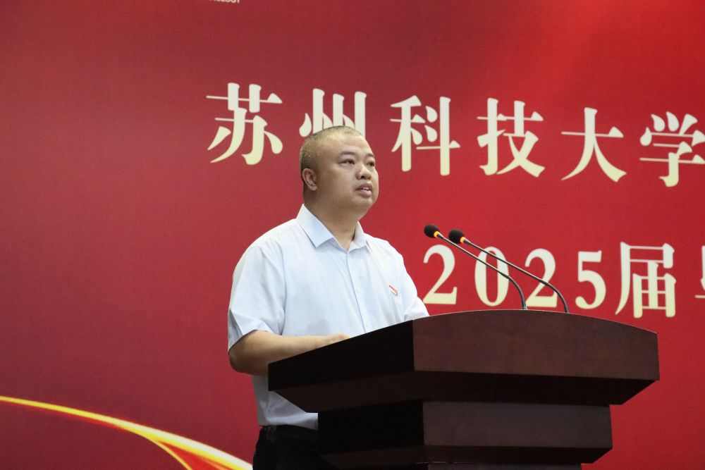 研究生毕业代表朱海发言,他呼吁同学们珍惜当下学习实践的每一刻,将其视为未来蓝图“不可或缺的基石材料”,并带着母校的期望、师长的教诲和同窗的情谊,勇敢踏上新征程,让“苏科大土木人”的光芒闪耀四方。