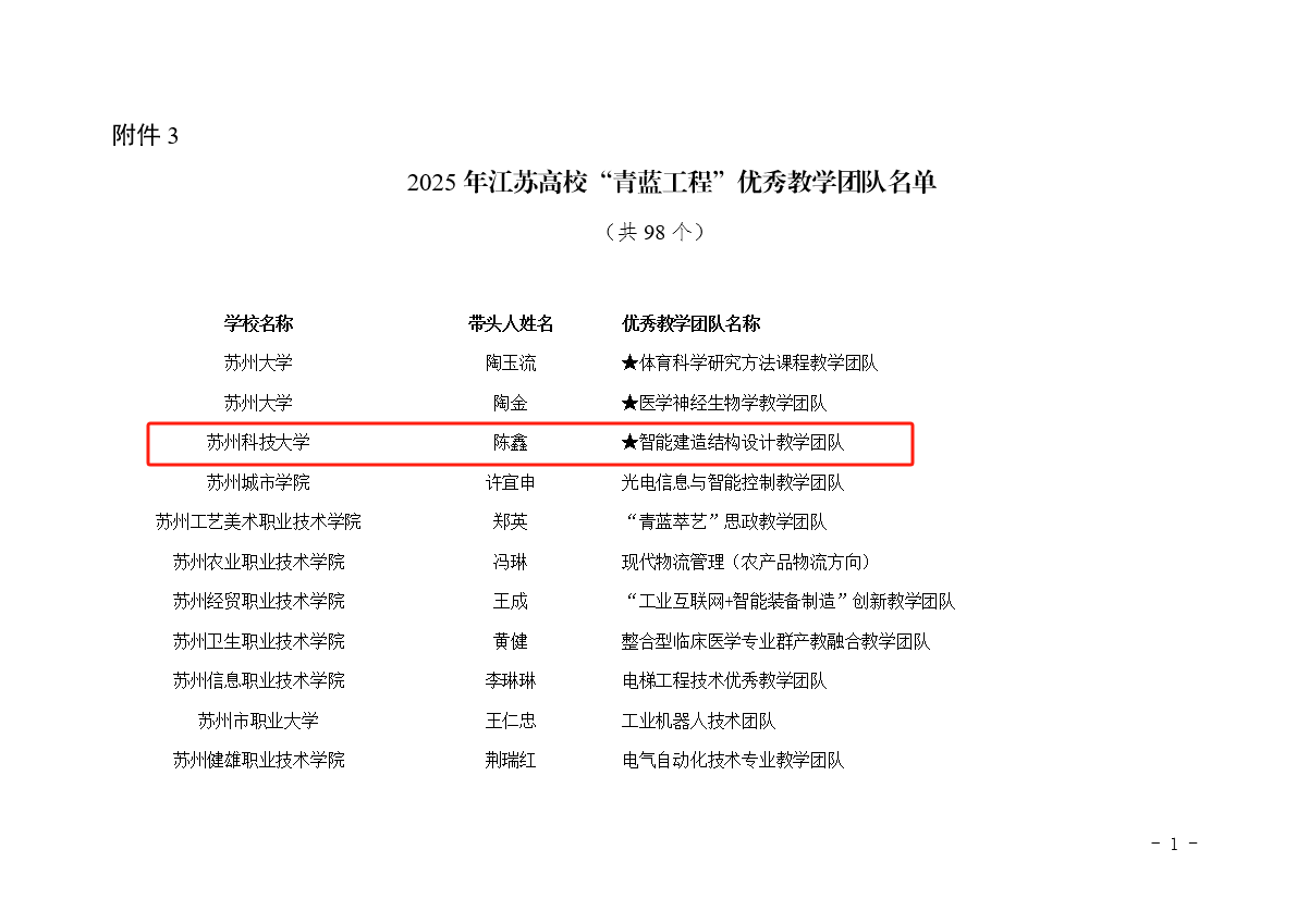 作者:廖想想 发布日期:2025-06-12 浏览:次日前,2025年江苏高校“青蓝工程”培养对象进行名单公示,我院陈鑫教授牵头的“智能建造结构设计教学团队”入选优秀教学团队培养对象,翟相华副教授入选优秀青年骨干教师培养对象。