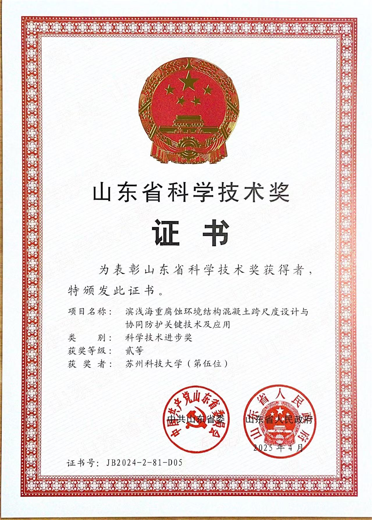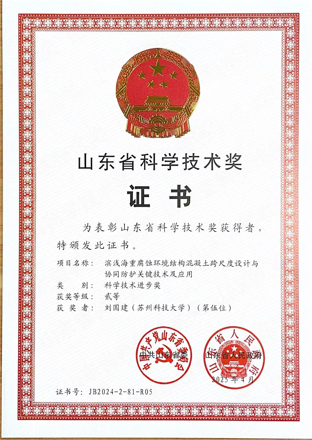 作者:蒋诚钢、申燕 图片作者:刘国建 来源:科技产业处、18porn 发布日期:2025-06-30 浏览:次6月27日,山东省召开全省科技大会,颁发了2024年度山东省科学技术奖。由山东高速集团有限公司牵头、18porn18porn 刘国建副教授为主要完成人的成果“滨浅海重腐蚀环境结构混凝土跨尺度设计与协同防护关键技术及应用”荣获科学技术进步奖二等奖。