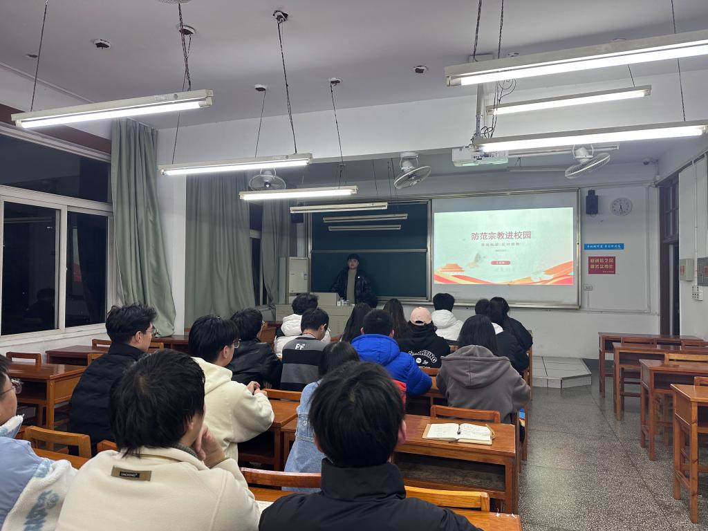 活动中,王国栋着重围绕“什么是正常的宗教活动”、“坚持宗教与教育相分离原则”、“四严禁”三个方面进行讲解,引导同学们如何有效抵御宗教渗透:一是时刻保持清醒的头脑;二是知法,懂法,坚决抵制校园宗教极端思想的传播;三是加强思想武装,崇尚科学;四是警惕邪教和其他非法组织。同时,王国栋还特别强调在学校严禁举行宗教活动、传播宗教思想、建立宗教团体,向同学们普及了校园宗教传播的危害性,讲述了大学生若遇到不法宗教进行所谓的“传教”行为务必保持头脑冷静,不可轻信,及时上报18porn 、学校保卫处或直接报警。活动中还特别设置了交流互动环节,同学们踊跃发言,充分表达自己对宗教的认识和看法,同学们也纷纷表示会坚定理想信念,用党的先进理论武装头脑,不信教,不传教。
