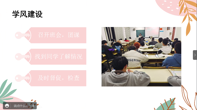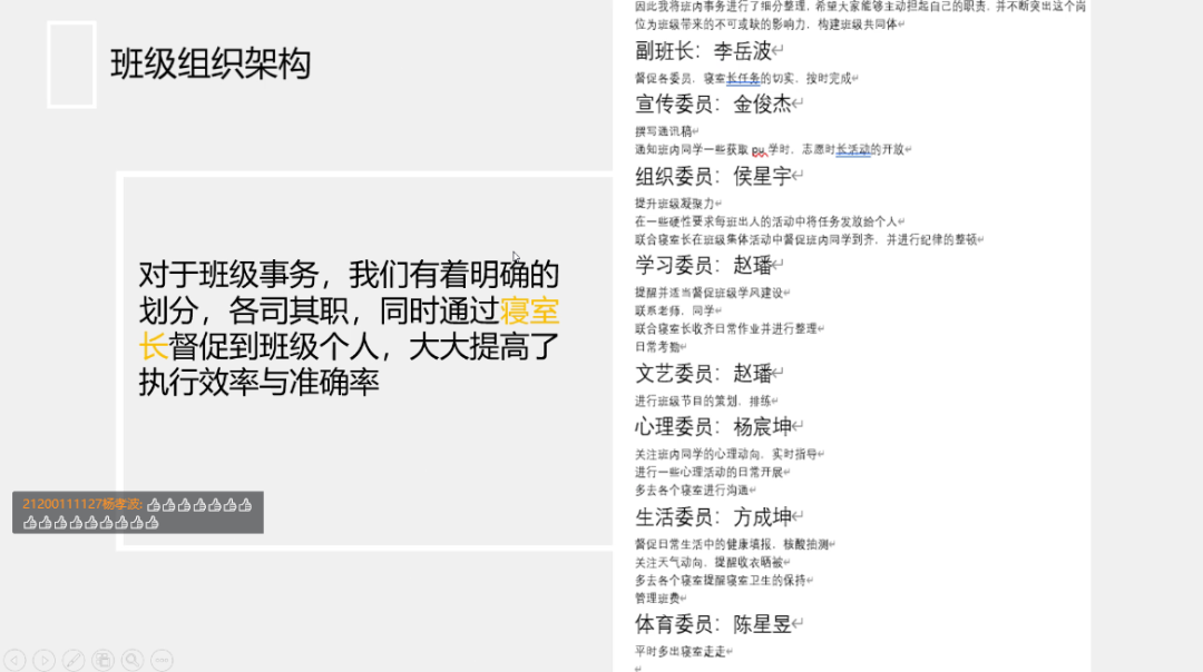 在线上答辩环节,每班代表通过PPT展示了本班一年以来的班团组织建设、思想纪律建设、班级学业建设和班级文体建设等各项成果,彰显出各班级团结向上的班风、深厚的班级文化底蕴以及强大的班级凝聚力。