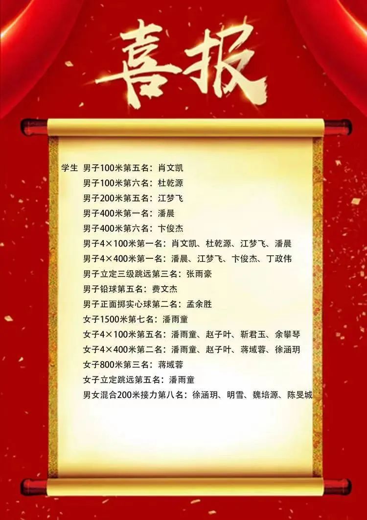 比赛阶段,100米预赛的赛场上,随着发令枪响,运动员们奋力向前冲刺,短短的十几秒看到了他们必胜的决心。偌大的1500米的跑道上,有运动员们一往无前的身影,有他们大步流星的步伐,有他们滴水穿石的毅力。接力赛的赛道上,即便对手十分强大,运动员们依旧勇往直前,奋勇拼搏,男子4*100和男子4*400皆摘下了桂冠。跳远的赛场上,运动员们用力摆臂,奋力一挥,起跳,平稳落地。运动场上,有运动员们的飒爽英姿,有他们拼搏的身影,他们毫不畏惧,任汗水打湿脊背,任疲惫爬满全身。