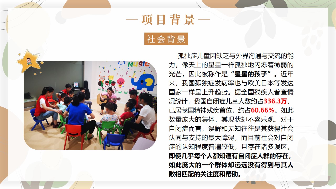 孤独症儿童因缺乏与外界沟通与交流的能力,像天上的星星一样孤独地闪烁着微弱的光芒,因此被称作是“星星的孩子”。近年来,我国孤独症发病率也与欧美日本等发达国家一样呈上升趋势。据全国残疾人普查情况统计,我国孤独症儿童人数约占336.3万,已居我国精神残疾首位,约占60.66%。(此数据截至到为20年统计数据)群体数量很庞大但是他们却没有得到与此相匹配的社会关注度。