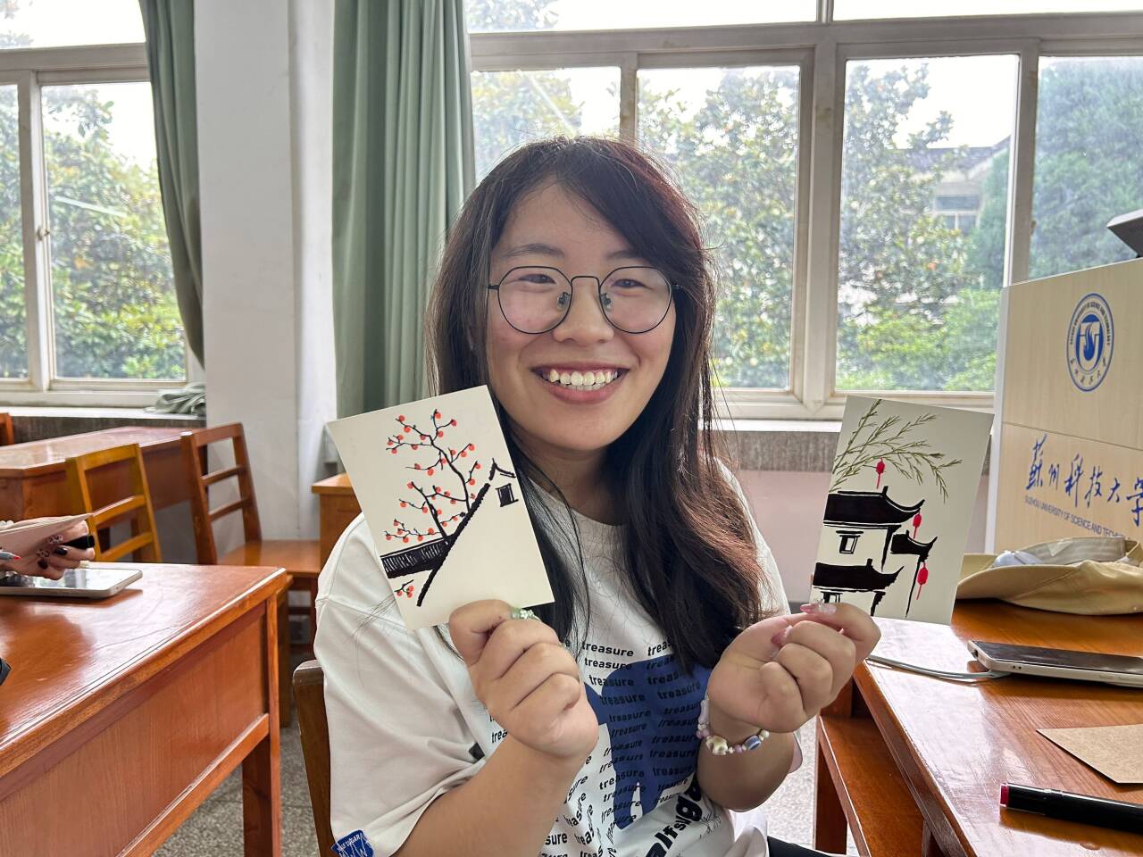 活动现场,工作人员精心布置创作区,并展示校园标志性建筑、苏州古典园林、现代地标等建筑素材图。创作环节中,同学们或临摹现场建筑图片,或构思“未来建筑乌托邦”,将穹顶、拱券、幕墙等建筑元素融入方寸明信片。2024级智能建造专业周杰同学以江枫校区结构大厅为原型,细腻地描绘了粉墙黛瓦的复古韵味。创作完成后,进行优秀作品评选,经过评委们认真筛选,一幅幅构思巧妙、绘制精美的作品脱颖而出,并在活动现场进行展示。