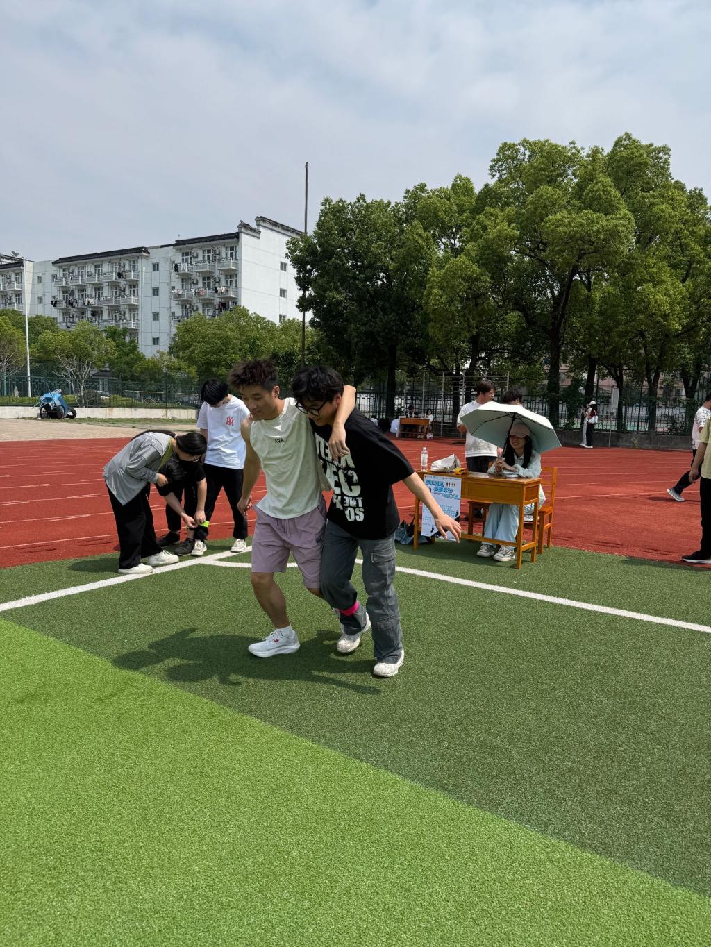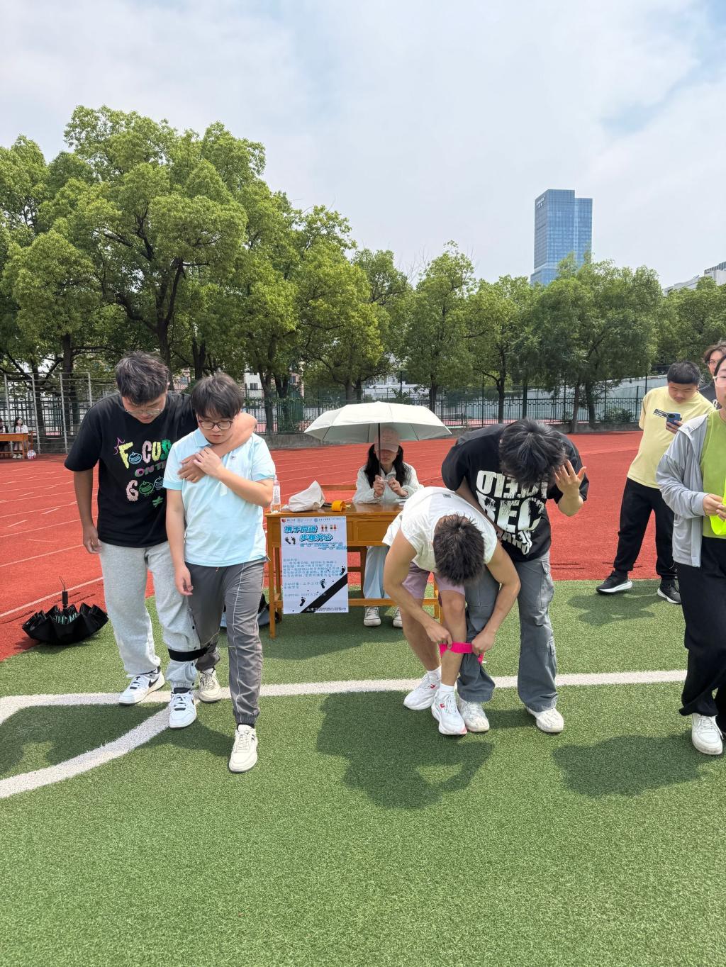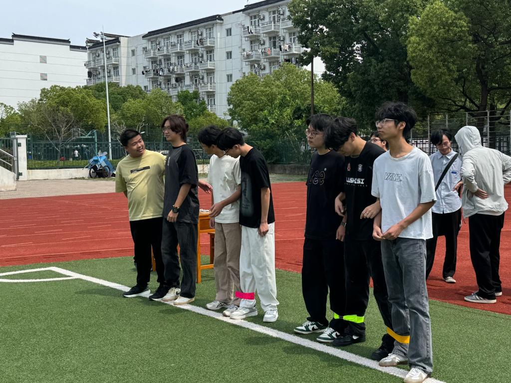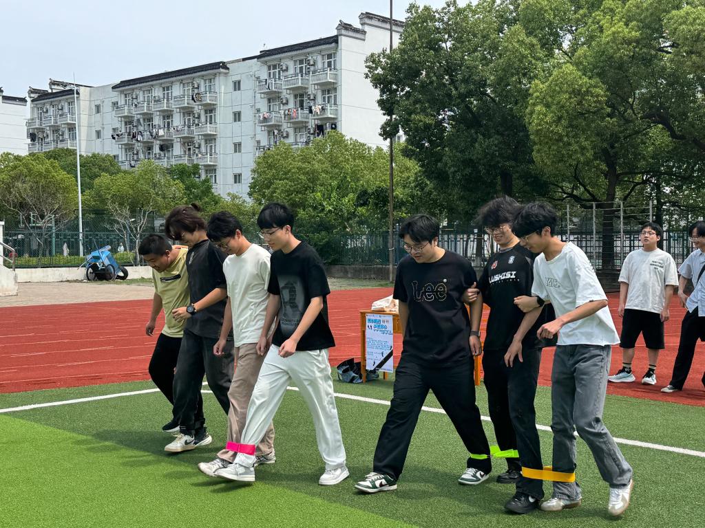 同学们积极组队参与,相邻学生将相邻侧腿绑在一起,喊着“左右左”,以独特的“同手同脚”步伐,努力协调走向终点。摇摆的身姿与坚定的节奏展现“同频共振”的力量。向终点迈进,相互鼓励、相互扶持。尽管过程中有的队伍步伐略显凌乱,但大家毫不气馁,迅速调整节奏,继续前行。这一项目不仅考验了队员之间的默契,更充分展现了团队协作精神。