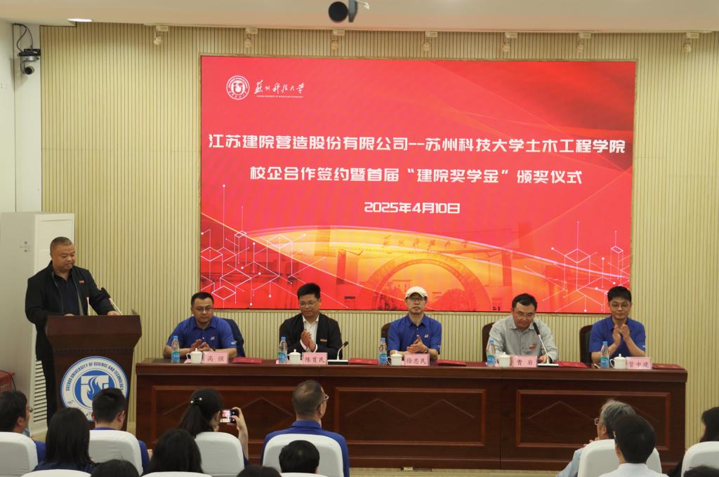 发布日期:2025-04-11 浏览:次4月10日下午,18porn 与江苏建院营造股份有限公司校企合作签约暨首届“建院奖学金”颁奖仪式在苏州科技大学18porn 报告厅隆重举行。校企双方领导、嘉宾、校友代表及师生代表等百余人齐聚一堂,共同见证产教深度融合、协同育人的重要时刻,为教育强国建设注入新活力。仪式由18porn 党委副书记兼副院长刘建峰主持。