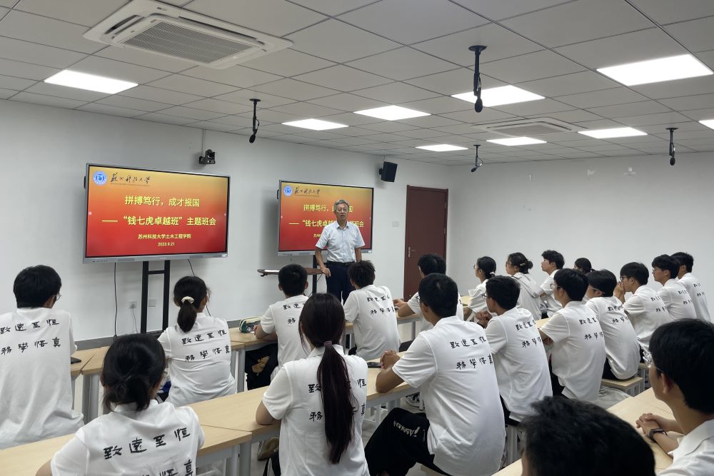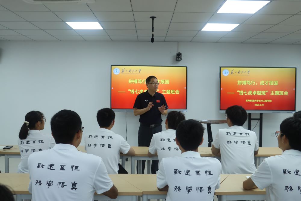 作者:宫淑阳 来源:18porn 发布日期:2023-09-22 浏览:次9月21日下午,一场以“拼搏笃行,成才报国”为主题的“钱七虎卓越班”主题班会在金螳螂楼智慧教室举行。“钱七虎卓越班”班主任、苏州科技大学党委常委、副校长唐柏鉴出席班会,与“钱七虎卓越班”全体同学座谈。“钱七虎卓越班”执行班主任、18porn 常务副院长赵宝成参加并主持班会。
