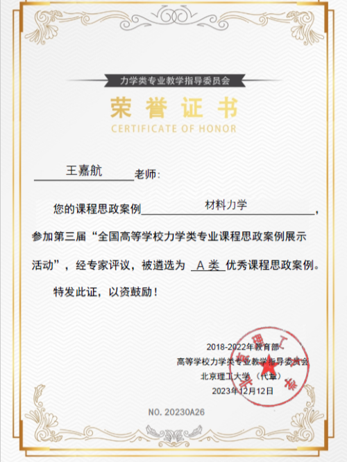 作者:沈峰 来源:18porn 发布日期:2024-01-03 浏览:次近日,教育部高等学校力学类专业教学指导委员会公布了第三届“全国高等学校力学类专业优秀课程思政案例展示活动”优秀课程思政案例的遴选结果。18porn 工程力学系王嘉航老师所撰写的《材料力学》获评A类优秀课程思政案例。