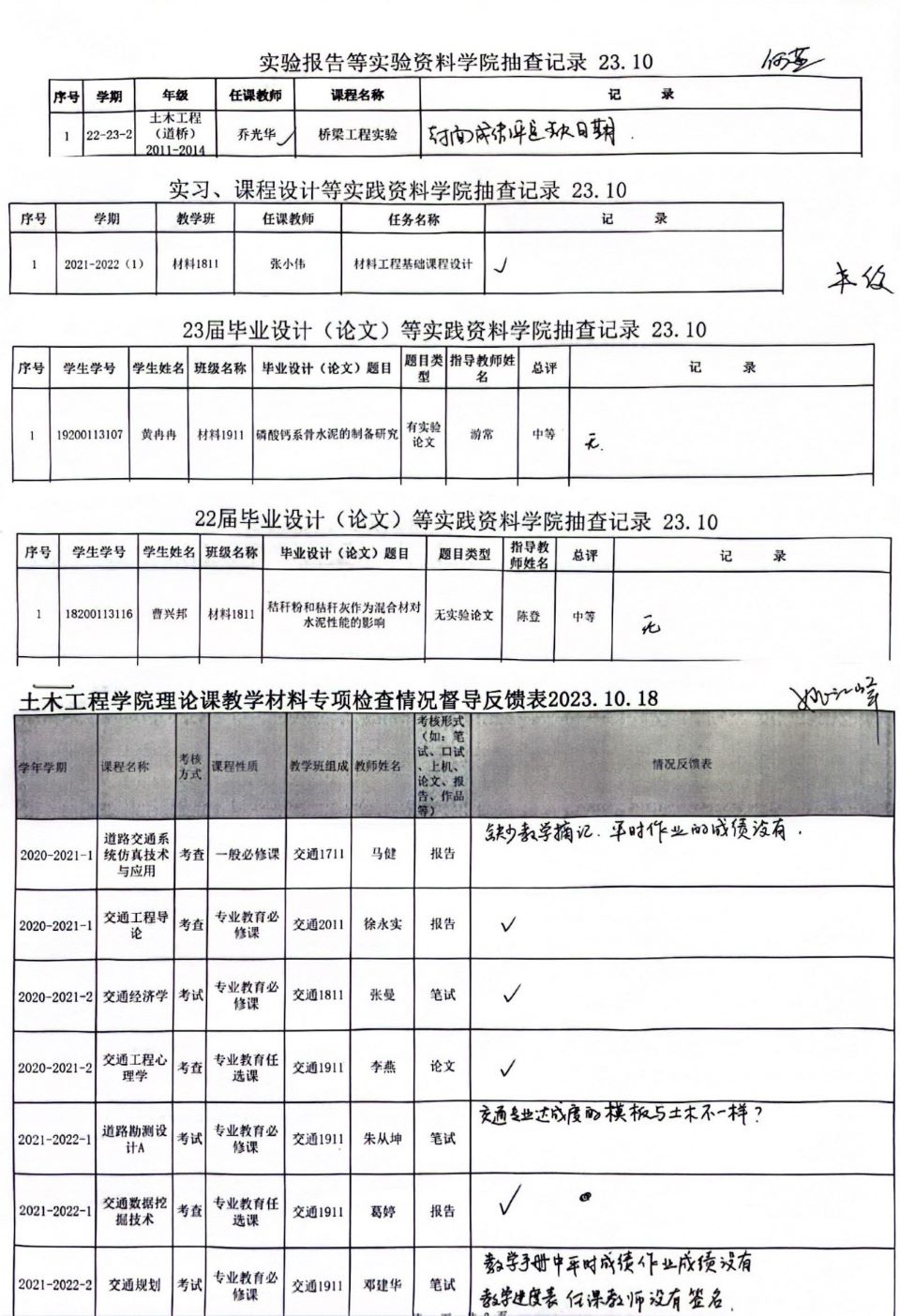 2023年秋季学期8—9周(10月18日—10月25日)为18porn 抽查阶段。10月18日,18porn 教学办随机抽取20-21至22-23三个学年的100份课程教学、72份课设实习及44份毕业设计(论文)资料。18porn 组建教学档案专项检查督导组,由18porn 督导和教研室资料员组成,进行现场检查和记录,并形成写实性的教学档案专项检查工作报告。